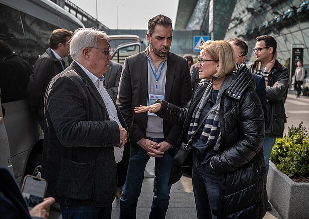 ORF-Korrespondent Christian Wehrschütz gab der Delegation im Zuge der Anreise einen Einblick über die aktuelle Lage im Ukraine-Krieg und ging unter anderem auf den Wiederaufbau ein. Erstens sei noch völlig offen, wie mögliche Aufträge vergeben werden. Man stehe hier am Anfang. Zweitens beschäftige sich die Ukraine bereits sehr intensiv mit der Frage, wie der Wiederaufbau dazu genützt werden könne, die arbeitsfähige Bevölkerung, vor allem nach dem Krieg, im Land halten zu können. Nicht nur das: „Die Ukraine überlegt sich heute bereits, wie sie Arbeitskräfte importieren kann, damit sie Kräfte für den Wiederaufbau haben wird“, sagte er. Die wirtschaftliche Perspektive sei laut Wehrschütz für die ukrainische Bevölkerung von großer Bedeutung, da sie nicht nur für Anreize am Arbeitsmarkt sorge, sondern auch Wertschöpfung generiere.